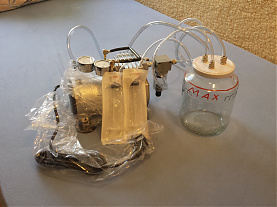 - A tisztítóvizet egy tiszta tálba, edénybe tegyük. A kelyhekből a dugót,(dugókat) egy kefével tisztítsuk meg, a kelyhetet mártsuk a tisztító vízbe, hogy a kompresszor beleszívhassa az üvegbe. Időnként emeljük ki a vízből, hogy egy kis levegőt is szívhasson. Gyakorlatilag ahol a tej közlekedik, ott fog a tisztítóvizünk is.